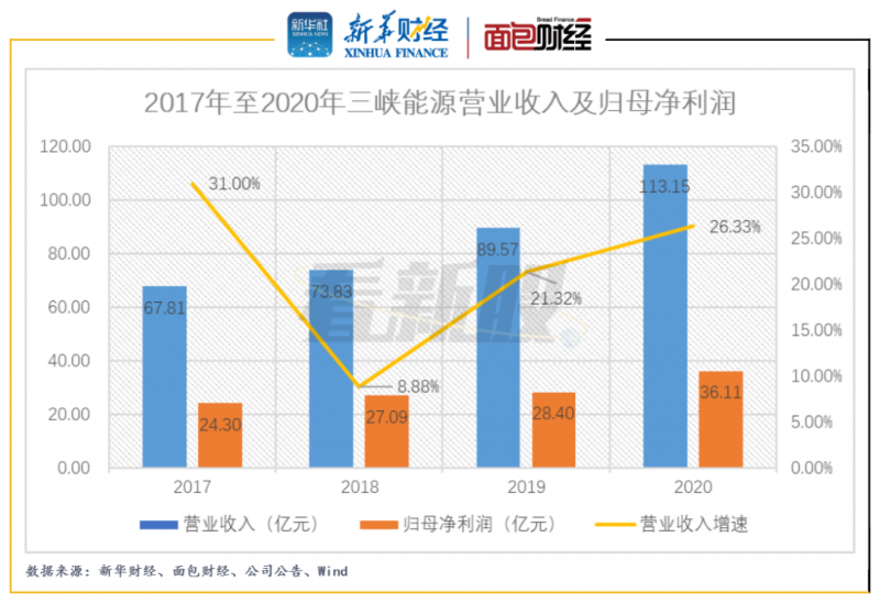 三峽能源主營(yíng)業(yè)務(wù)為風(fēng)能、太陽(yáng)能的開(kāi)發(fā)、投資和運(yùn)營(yíng)。2018年至2020年,公司實(shí)現(xiàn)營(yíng)業(yè)收入分別為73.83億元、89.57億元、113.15億元,同比分別增加8.88%、21.32%、26.33%;實(shí)現(xiàn)歸母凈利潤(rùn)分別為27.09億元、28.40億元、36.11億元,同比分別增加11.48%、4.84%、27.16%。