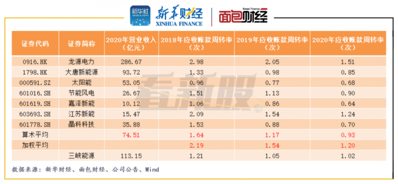 應(yīng)收賬款規(guī)模較大的現(xiàn)象,在風(fēng)電、光電行業(yè)較為普遍。根據(jù)三峽能源招股書(shū)中提到的龍?jiān)措娏Φ?家上市公司列為可比公司(華能新能源已退市,不列入可比范圍),對(duì)其應(yīng)收賬款周轉(zhuǎn)率進(jìn)行統(tǒng)計(jì)如圖:
