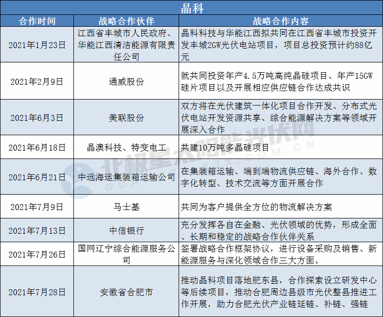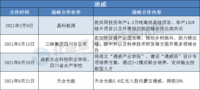 據北極星太陽能光伏網不完全統計,2021年初至今,已有晶科、通威、晶澳、特變電工、天合光能5家光伏企業在通過增資入股、合資擴產形式成為深度戰略合作伙伴。