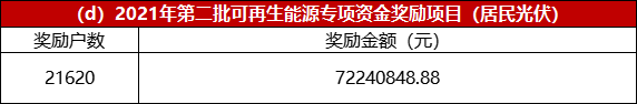而2021年第二批光伏專項資金獎勵項目共計22894個,獎勵金額2.68億。其中光伏電站項目13個,獎勵金額3531千萬;企業光伏項目1261個,獎勵金額1.605億;居民光伏21620戶,獎勵金額7224千萬。