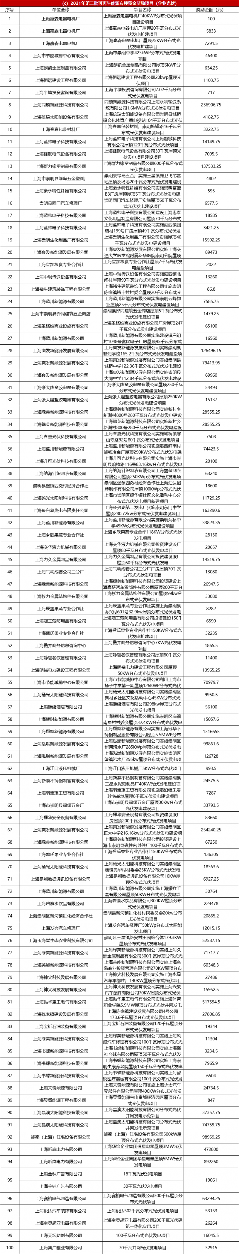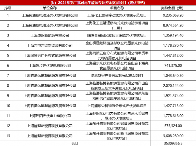 8月25日,上海市發展和改革委員會發布上海市2021年度第二批可再生能源專項資金撥付計劃(草案)公示,獎勵金額共計4.43億元。根據文件,其中2021年第二批風電專項資金獎勵項目共計7個,獎勵金額1.75億。