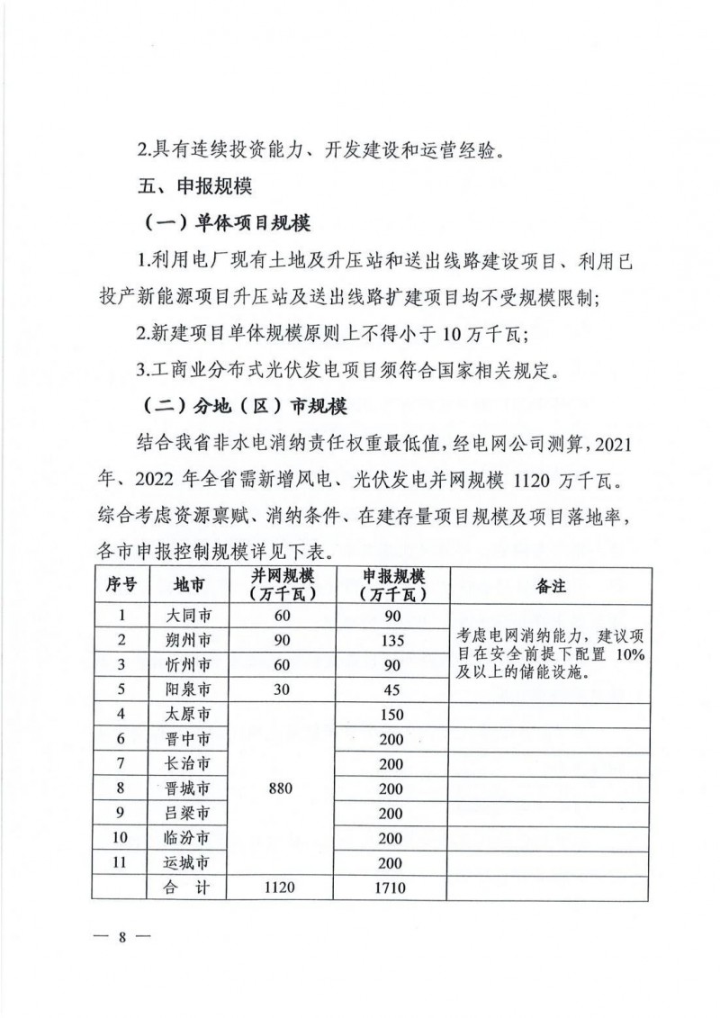 結(jié)合山西省非水電消納責(zé)任權(quán)重最低值,經(jīng)電網(wǎng)公司測(cè)算,2021年、2022年山西省需新增風(fēng)電、光伏發(fā)電并網(wǎng)規(guī)模1120萬(wàn)千瓦。文件明確晉北三市暫不考慮風(fēng)電競(jìng)配項(xiàng)目,其余地市風(fēng)光發(fā)電項(xiàng)目規(guī)模按2:8比例申報(bào)。