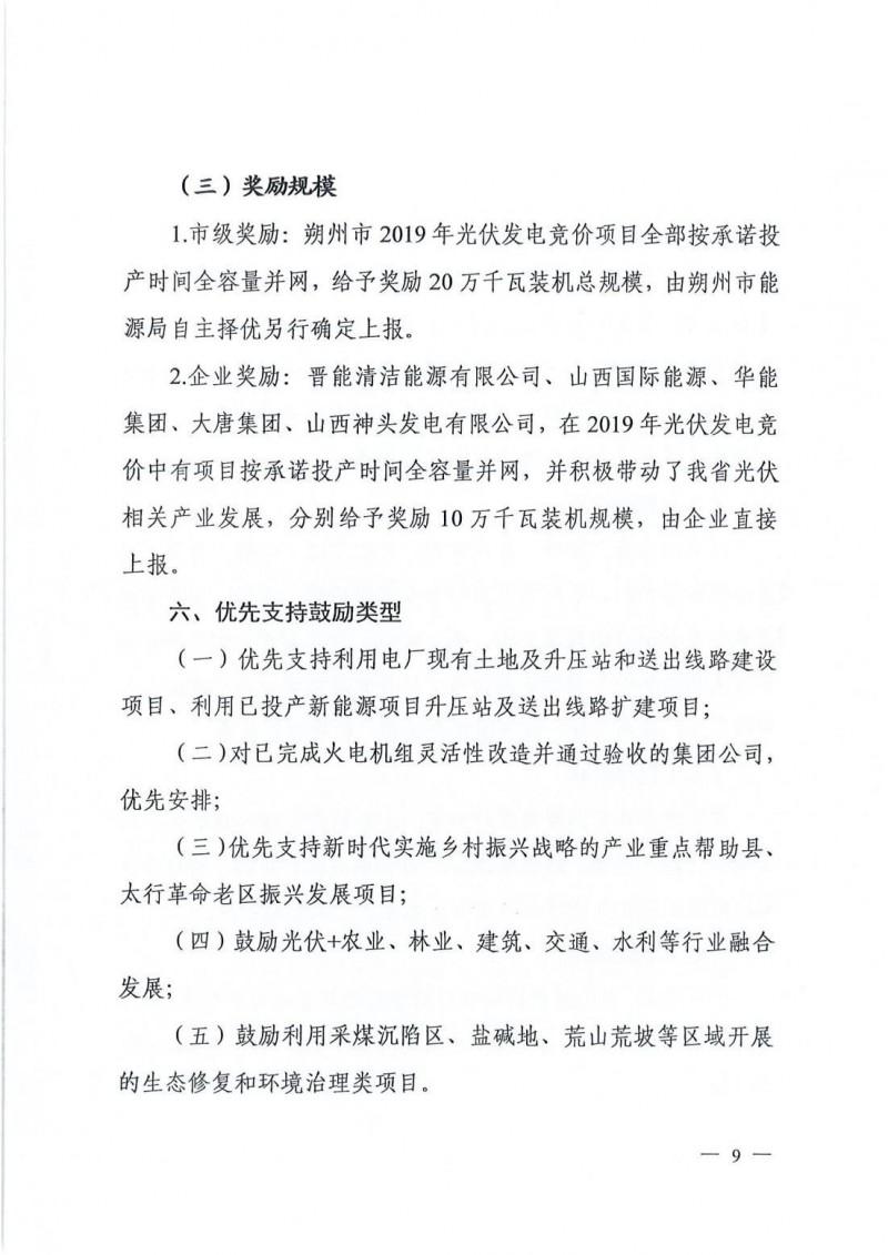 晉能清潔能源有限公司、山西國際能源、華能集團、大唐集團、山西神頭發電有限公司,在2019年光伏發電競價中有項目按承諾投產時間全容量并網,并積極帶動了山西省光伏相關產業發展,分別給予獎勵10萬千瓦裝機規模,由企業直接上報。