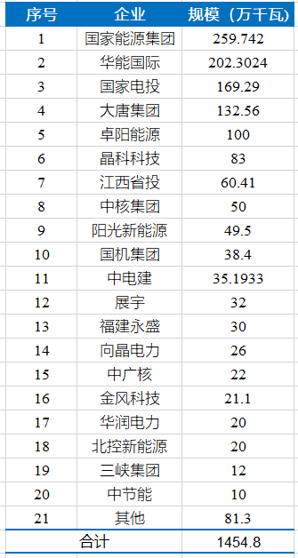 從投資企業來看,國家能源集團及參股的項目的規模最大,約為2.6GW;華能及參股的項目的規模也超過2GW;國家電投、大唐、卓陽能源均獲得1GW及以上規模。具體如下表所示。