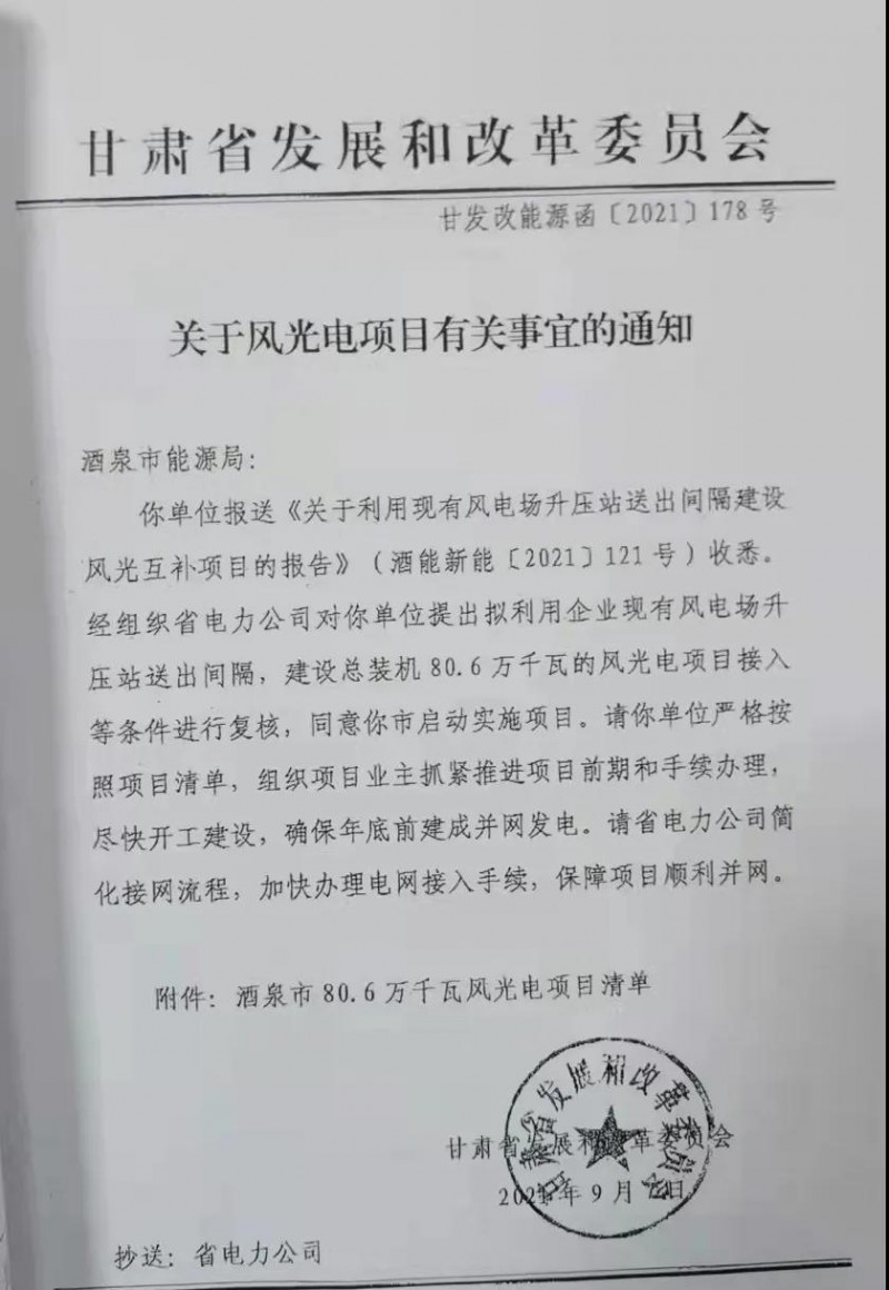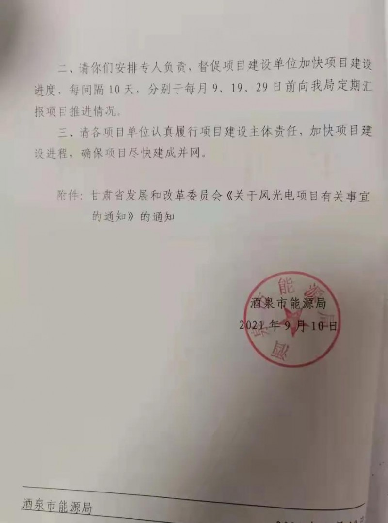 酒泉市能源局也下發相應文件要求項目在9月底前開工建設每間隔10天,在每月的9日、19日、29日向酒泉能源局定期匯報項目推進情況,加快項目建設進程,確保項目盡快建成并網。