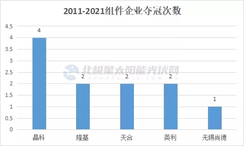 2011-2021年全球光伏組件出貨量NO.1幾易其主,據北極星太陽能光伏網梳理,晶科榮登寶座4次,天合奪冠2次,黑馬隆基于2020年超越晶科,奪得全球組件出貨第一的寶座,2021年大概率蟬聯冠軍。此外,無錫尚德登頂1次,英利登頂2次。