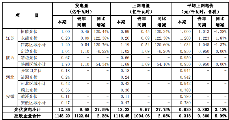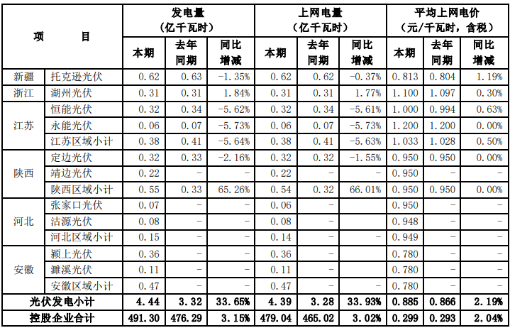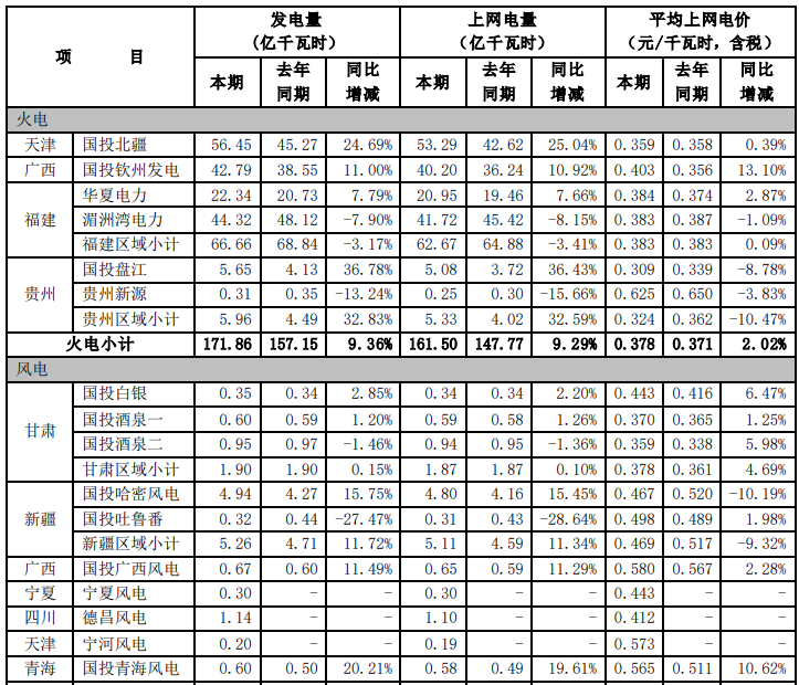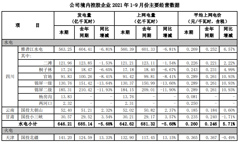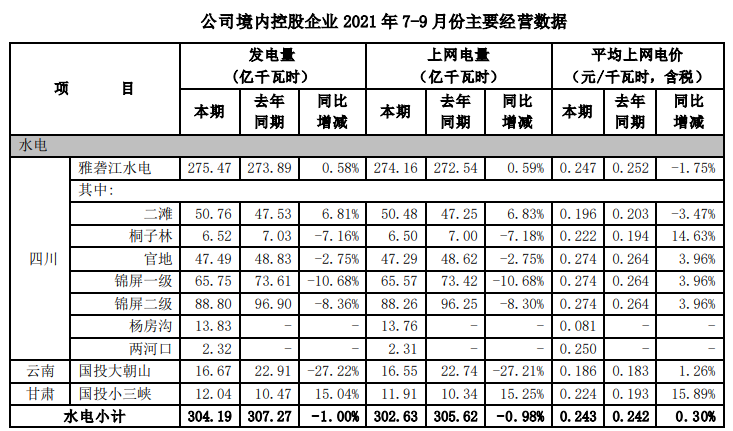 根據國投電力控股股份有限公司(以下簡稱公司)境內控股企業初步統計, 2021年 7-9 月,公司境內控股企業累計完成發電量491.30 億千瓦時,上網電量479.04 億千瓦時,與去年同期相比分別增加3.15%和3.02%。2021年1-9月,公司境內控股企業累計完成發電量1148.29億千瓦時,上網電量1116.45億千瓦時, 與去年同期相比分別增加 2.28%和2.05%。 2021年7-9 月,公司境內控股企業平均上網電價0.299 元/千瓦時,與去年同期相比增加了 2.04%。