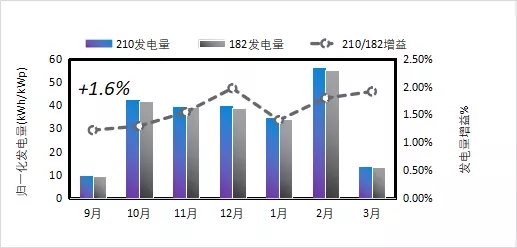 綜合2021年4月~9月數據,210單面組件單瓦發電量較182單面組件高1.2%。