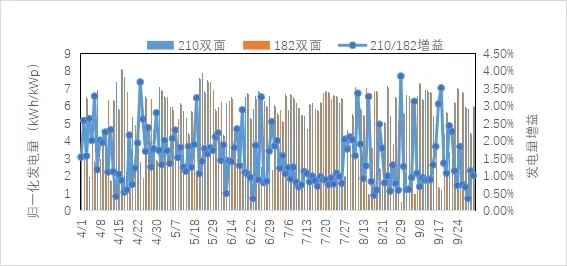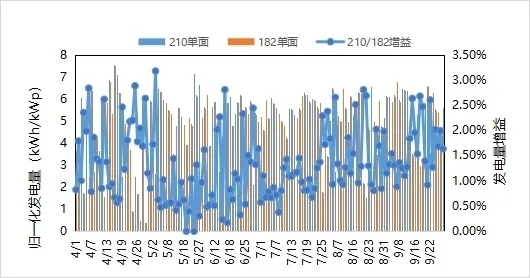 得益于210雙面組件更高的雙面率,綜合2021年4月~9月數據,210雙面組件單瓦發電量高于182雙面組件1.3% :