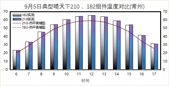 為探究組件真實戶外工作溫度,使用HIOKI熱電偶數據采集儀對組件進行工作溫度采集。實證結果顯示,210與對比測試樣件溫度幾乎無差異,根據輻照加權平均溫度,210組件甚至略低于對比組件0.5℃。使用PVsyst仿真,組件相同溫度系數的情況下,在常州,工作溫度每降低1℃,發電量提升約為0.2%。同時,選取9月5日典型天氣,將實測數據及實測氣象數據代入穩態熱平衡模型,更證明了高電流、低開壓的210組件無明顯溫升,且在早晚輻照及溫度較低時,210組件組件工作溫度較低。