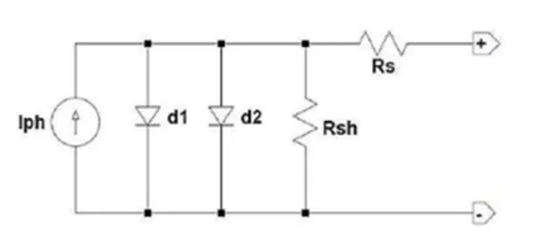 為研究210低輻照性能優勢,本文以雙二極管模型對測試樣件進行建模分析;二極管模型表征電池及組件特性被廣泛使用,例如PVsyst中的PAN file; 在傳統的單二極管模型上,雙二極管模型額外考慮了耗盡區的復合損耗,可以有效驗證低輻照下組件性能: