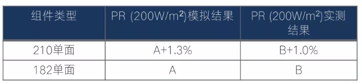 模擬結果顯示210組件低輻照性能PR200W/m2較182組件高1.3%