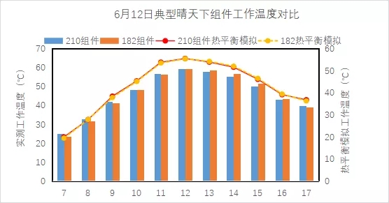 任選典型晴天下,組件工作溫度實測與模擬結果均顯示,210組件并無高工作溫度風險,且早晚低輻照時段,210組件溫度略有優勢: