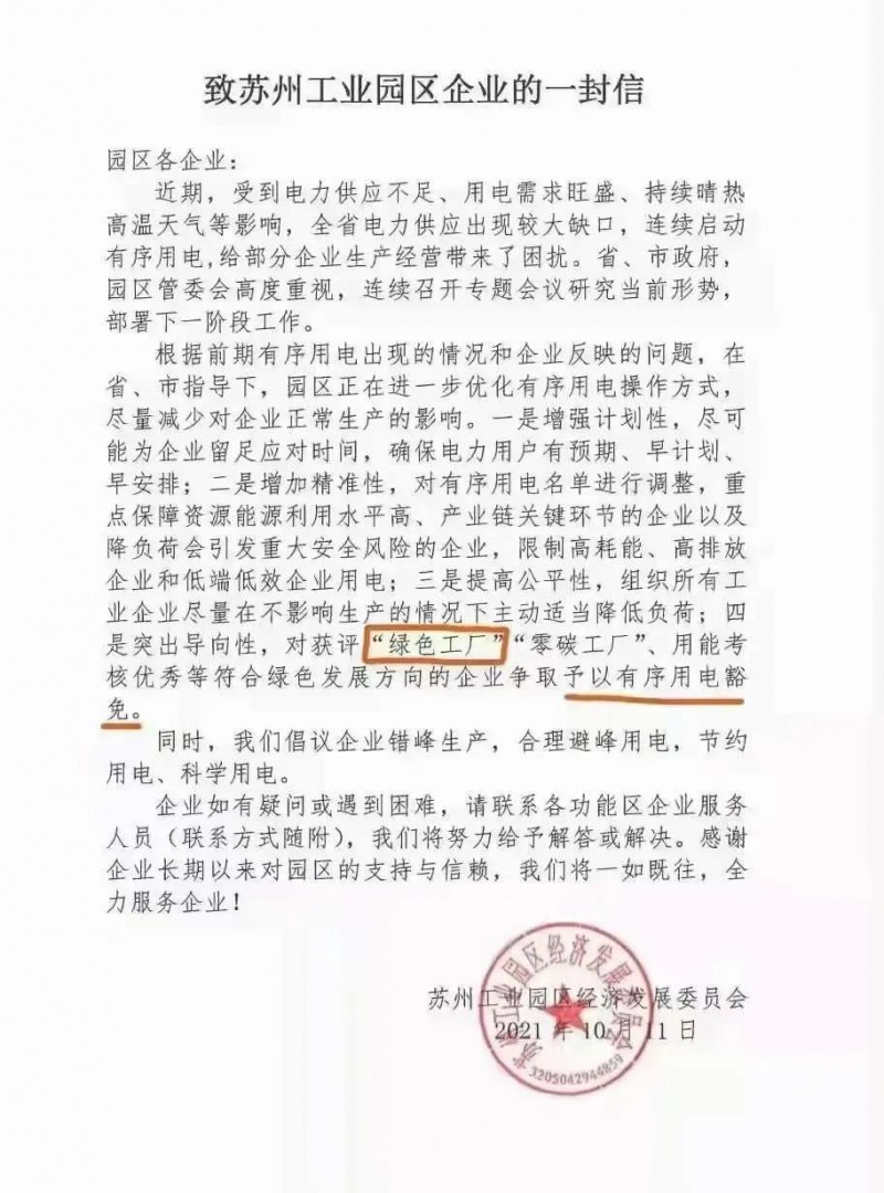 里面提到,近期受到電力供應不足、用電需求旺盛、持續晴熱高溫天氣等影響,電力供應出現較大缺口,連續啟動有序用電,給部分企業生產經營帶來了困擾。在突出導向性中,提出對獲評“綠色工廠”“零碳工廠”、用能考核優秀等符合綠色發展方向的企業爭取予以有序用電豁免。