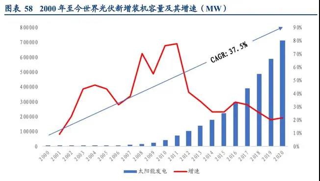 2014 年之后,光伏發電行業經過優勝劣汰的篩選,發電成本持續大幅下降,投資回報重 新獲得平衡,全球更多的國家加入到支持光伏發電的行列,具有技術研發優勢、規模優勢的企業涌現。縱觀歷史,近20年間光伏增速年均復合增長率達 37.5%。