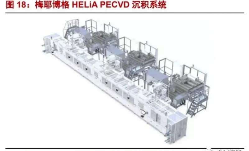 2)PECVD(非晶硅薄膜沉積):該步驟取代了傳統(tǒng)PERC工藝中的擴(kuò)散工藝,是構(gòu)造異質(zhì)結(jié)結(jié)構(gòu)的關(guān)鍵,難度、壁壘最高,價(jià)值占到全部設(shè)備的50%,為異質(zhì)結(jié)設(shè)備的核心。從技術(shù)路徑上:板式PECVD是目前主流,管式PECVD、Cat-CVD具潛力。國外廠商包括:梅耶博格(已不對(duì)外提供)、應(yīng)用材料等。國內(nèi)廠商包括:邁為股份、金辰股份、捷佳偉創(chuàng)、理想能源、鈞石能源等。
