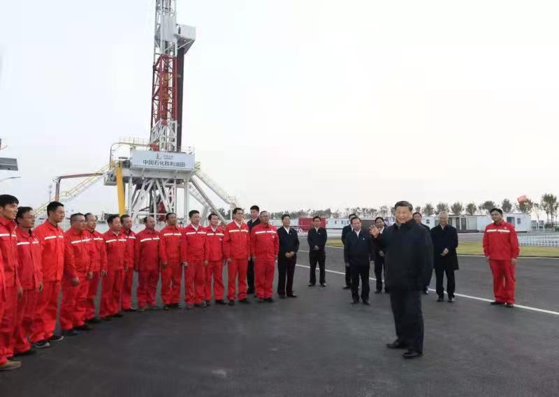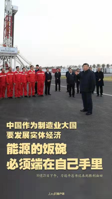 10月21日下午,習近平總書記來到勝利油田,登上鉆井平臺,察看作業情況,看望慰問石油工人。今年是勝利油田發現60周年。習近平代表黨中央向廣大石油職工致以誠摯問候。習近平指出,石油能源建設對我們國家意義重大,中國作為制造業大國,要發展實體經濟,能源的飯碗必須端在自己手里。希望你們再創佳績、再立新功。