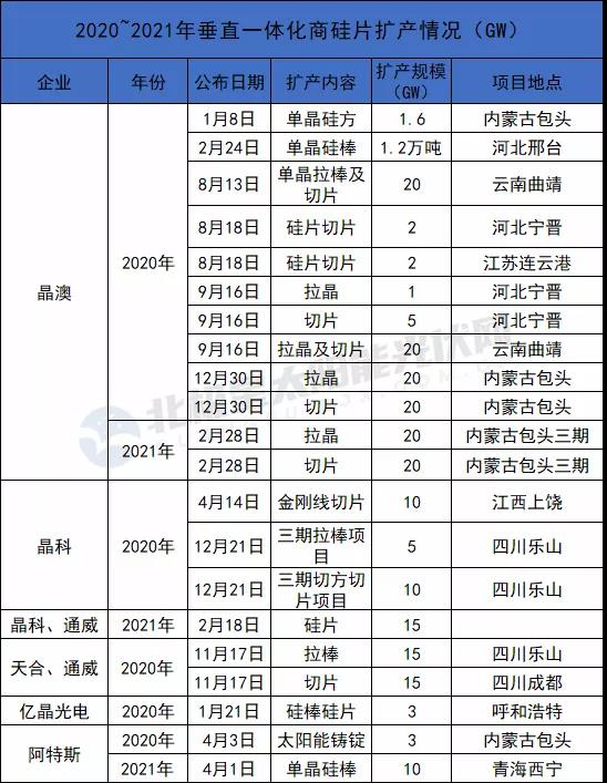 據(jù)北極星太陽能光伏網(wǎng)統(tǒng)計(jì)公開信息,2020~2021年,晶澳、晶科、天合、億晶光電、阿特斯5家垂直一體化商共公布了超218GW的硅片(硅棒、切片)擴(kuò)產(chǎn)計(jì)劃。