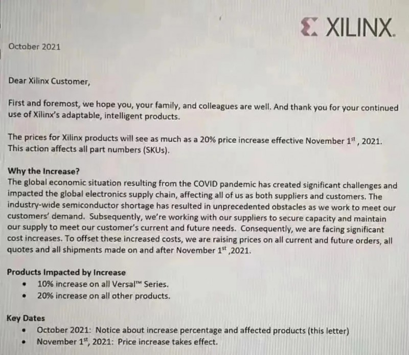 9月底,多家主要海外芯片生產商紛紛宣布,對IGBT和IC半導體等核心芯片展開新一輪漲價。意法半導體表示,將在今年最后一個季度提高所有產品價格,包括現有庫存;安森美則是從10月初開始,對部分產品漲價生效,新價格將適用于新訂單和現有積壓訂單;此外,賽靈思也發布通知稱,將會提高2021年11月1日及之后所有當前和未來的訂單、所有報價和所有發貨的價格。