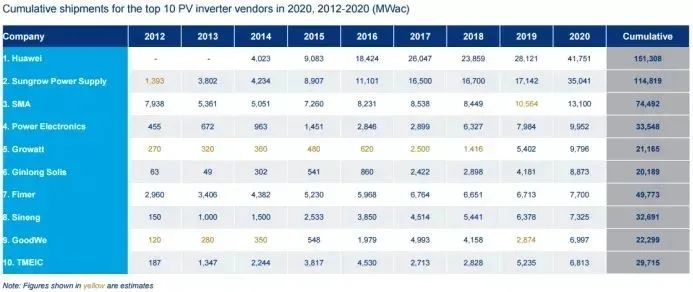 (2012-2020年全球前十逆變器供應商的出貨數據統計。來源:伍德麥肯茲)