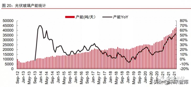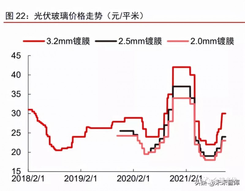 2021年光伏玻璃價(jià)格大幅回落,2022年價(jià)格或?qū)⒕S持中低位波動(dòng)。光伏玻璃供需格局的變化也反應(yīng)在企業(yè)庫(kù)存。據(jù)卓創(chuàng)資訊統(tǒng)計(jì),2021H1,隨著行業(yè)產(chǎn)能擴(kuò)張以及需求延后,光伏玻璃行業(yè)主流廠商庫(kù)存天數(shù)由年初10天以內(nèi)快速增至40天左右;受此影響,光伏玻璃價(jià)格也于4月從高點(diǎn)出現(xiàn)“腰斬式”下跌。隨著Q3后庫(kù)存逐步消化回落,以及受純堿價(jià)格大幅上漲推動(dòng),光伏玻璃價(jià)格從底部開(kāi)始有所回升,目前3.2mm產(chǎn)品價(jià)格約30元/平米,2.0mm產(chǎn)品價(jià)格約23元/平米。展望2022年,我們認(rèn)為在原材料成本有望逐步回落,且行業(yè)供需格局總體保持寬松的情況下,光伏玻璃價(jià)格有望在中低水平整體保持穩(wěn)定,預(yù)計(jì)3.2mm和2.0mm玻璃價(jià)格或?qū)⒃?5元/平米和20元/平米的中樞附件波動(dòng)。