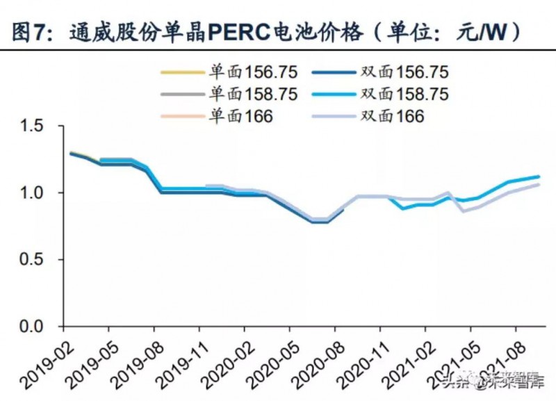 單雙面電池/組件幾乎同價,雙面增益滲透率不斷提升。根據Wind,通威股份PERC單雙面電池片報價已趨于一致。根據Solarzoom,一線廠商單雙面組件成交價差也在0.02元/W以內。由于雙面組件背面發電增益帶來的性價比提升,滲透率正在快速提升,根據CPIA統計,雙面組件市場份額已從2018年的2%提升至2020年的30%,預計2025年有望達到60%以上。