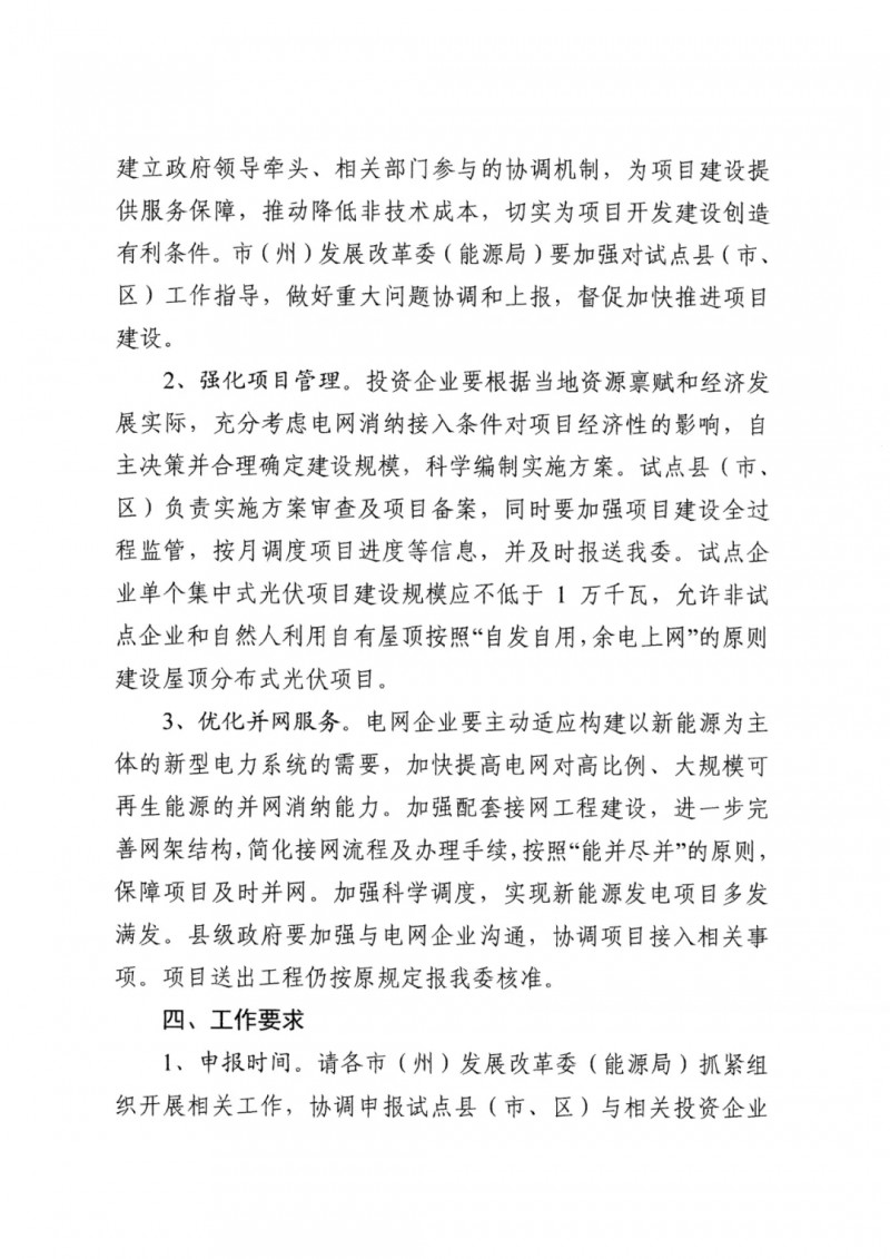已納入國家試點的12個整縣屋頂分布式光伏試點縣,如縣(市、區)政府和原開發企業按要求達成合作并按時上報相關材料的,可將試點范圍擴大至含地面分布式和集中式在內的全部光伏項目,一并納入試點范圍。