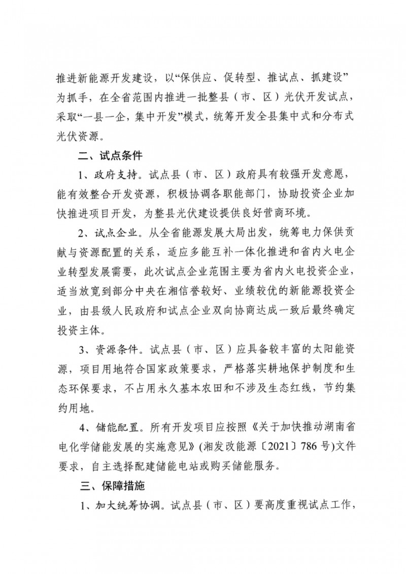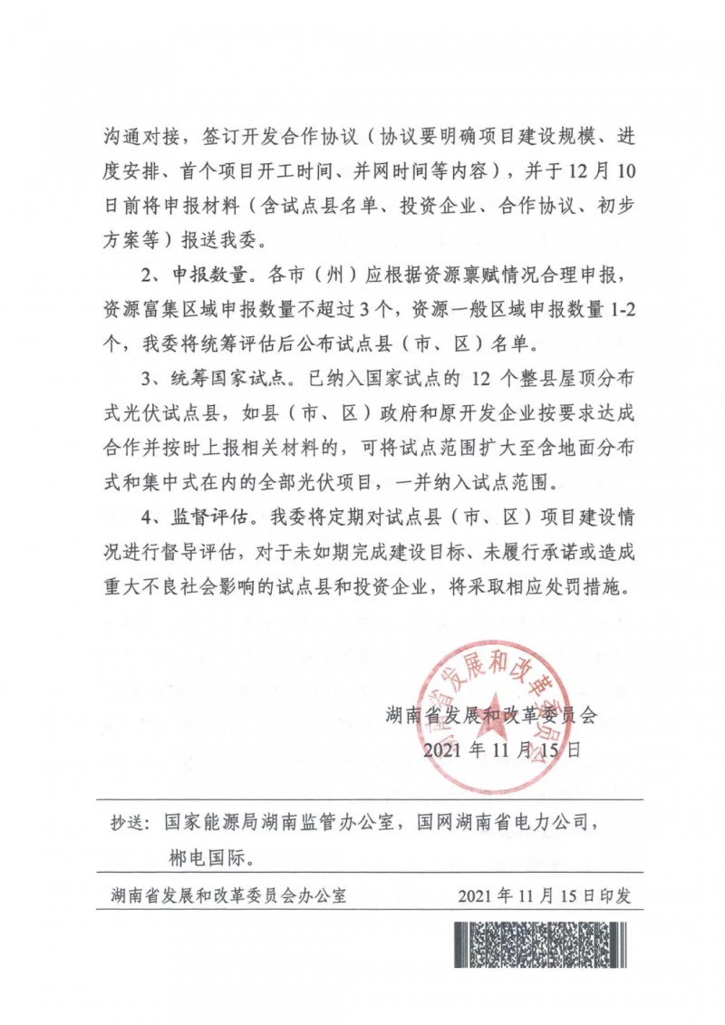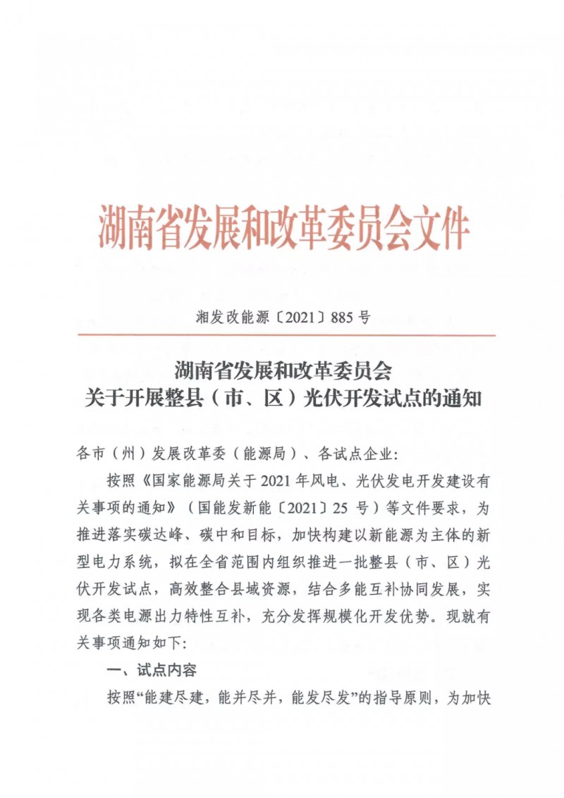 11月15日,湖南省發改委下發《關于開展整縣(市、區)光伏開發試點的通知》,擬在全省范圍內組織推進一批整縣(市、區)光伏開發試點,高效整合縣域資源,結合多能互補協同發展。