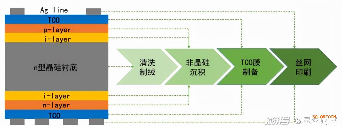 HJT本質上是一種光伏單晶電池片。HJT電池是雙面電池結構,最中間是N型晶體硅,在晶體硅其中一面依次沉積本征非晶硅薄膜和P型薄膜,就形成了P-N結(功能是把光能轉化成電能)。由于非晶硅的導電性比較差,需要再在電池兩側沉積透明導電薄膜(TCO)來進行導電,最后采用絲網印刷技術形成雙面電極。