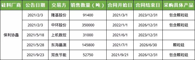保利協鑫與下游客戶陸續簽訂采購長單:保利協鑫與隆基、中環、上機、晶澳、雙良等下游客戶簽訂硅料采購長單,總供應量68.46萬噸,年均供應量22.82萬噸;其中,隆基、中環、雙良采購產品中明確包含顆粒硅產品,晶澳將于未來5年向協鑫采購總計14.58萬噸顆粒硅;而上機則將與保利協鑫共建30萬噸顆粒硅產能。下游客戶長單采購表明了顆粒硅進一步獲得認可。