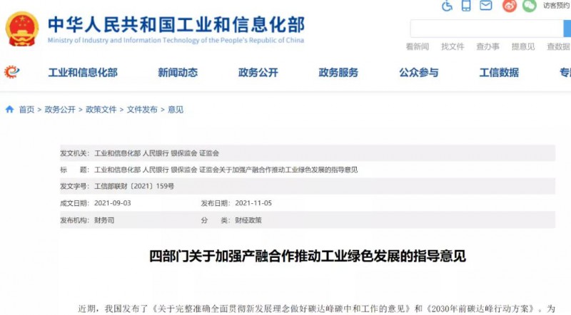 近期,我國發布了《關于完整準確全面貫徹新發展理念做好碳達峰碳中和工作的意見》和《2030年前碳達峰行動方案》。為貫徹落實習近平總書記關于金融服務實體經濟系列重要指示精神和黨中央、國務院關于碳達峰、碳中和重大決策部署,工業和信息化部、人民銀行、銀保監會、證監會聯合發布《關于加強產融合作推動工業綠色發展的指導意見》(工信部聯財〔2021〕159號),建立商業可持續的產融合作推動工業綠色發展路徑,推動建設工業綠色低碳轉型與工業賦能綠色發展相互促進、深度融合的產業體系,以工業綠色化引領高端化、智能化發展,促進工業穩增長和有效投資,助力制造強國和網絡強國建設,推動經濟社會綠色發展,為應對全球氣候變化貢獻力量。