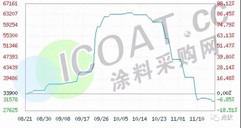 有機硅則隨著工業硅價格下行,行情急轉直下,目前報價在31000-32000元/噸左右,較10月初63000元/噸的高位幾近腰斬。聊城芫澤化工、山東東岳化工、山東魯西化工報價在30400元/噸左右,短短兩個月價格暴跌32000元/噸。