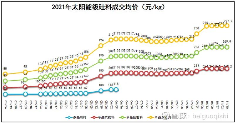 光伏原材料多晶硅價格從年初的88元/kg(復投料),一路上漲至本周的272元/kg,上漲幅度之大超出了大多數人的預期。最近一個多月一直在272元/kg左右徘徊。