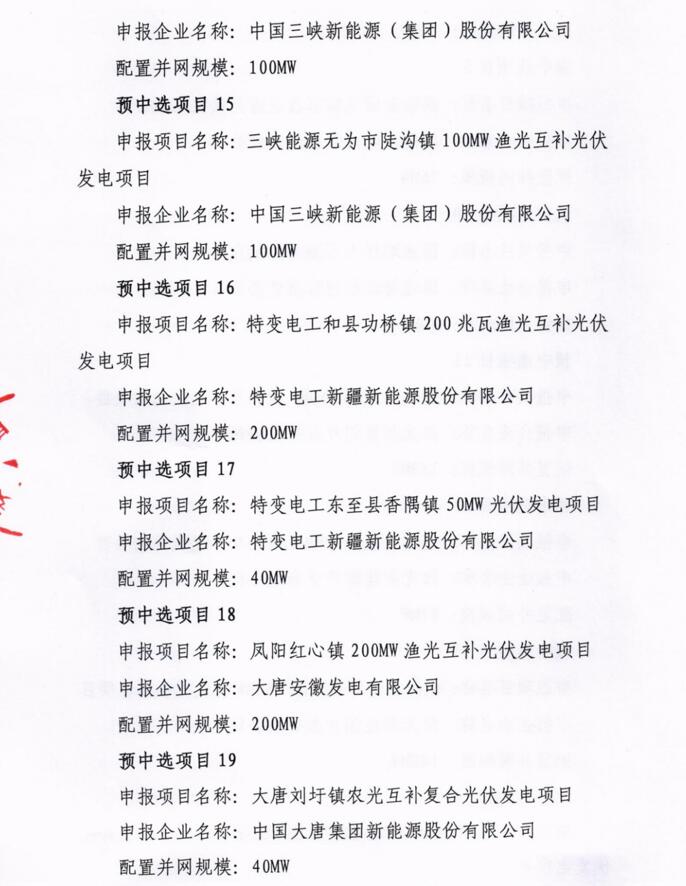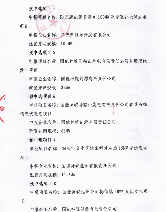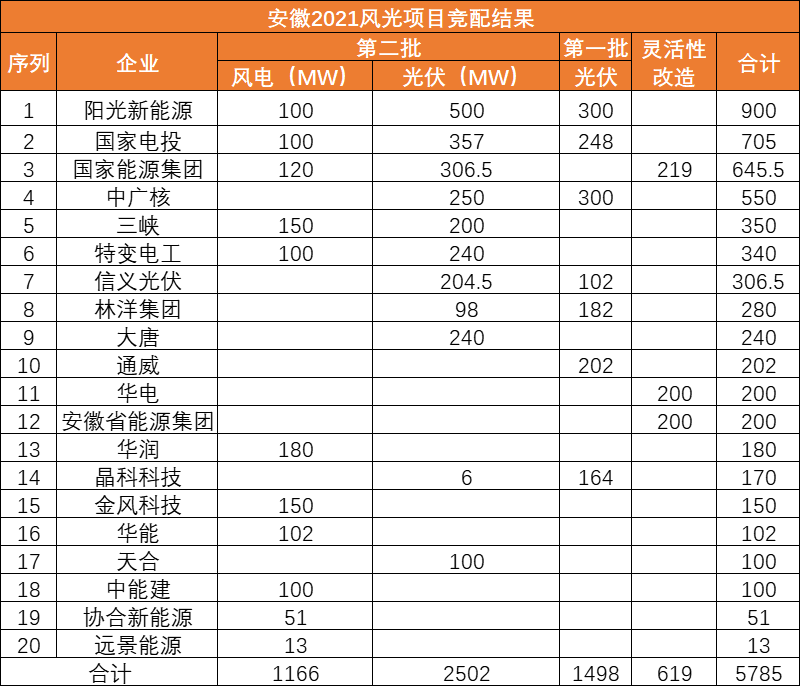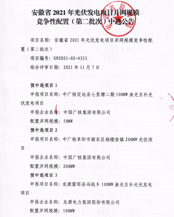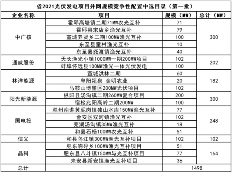 此前10月21日,安徽省能源局下發(fā)《2021年光伏發(fā)電項目并網(wǎng)規(guī)模競爭性配置(第一批次)中選公告》,規(guī)模共計1498MW。中廣核、陽光新能源、國家電投、通威、林洋、晶科、信義光能等7家企業(yè)中標20個光伏第一批優(yōu)選項目。加上此次安徽省總共公示了4GW光伏、1.166GW風(fēng)電項目。