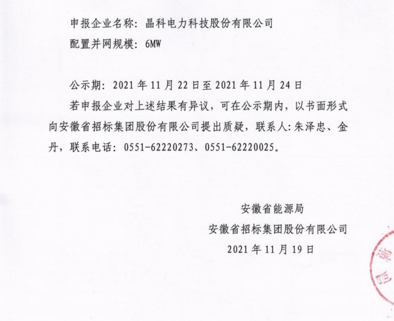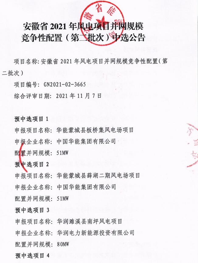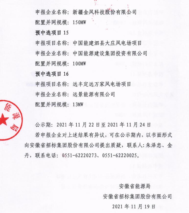 11月19日,安徽省能源局下發(fā)了《安徽省2021年光伏發(fā)電項目競爭性配置(第二批次)中選公告》和《安徽省2021年風(fēng)電項目競爭性配置(第二批次)中選公告》,其中,光伏30個項目總規(guī)模為2502MW;風(fēng)電6個項目總規(guī)模為1166MW。