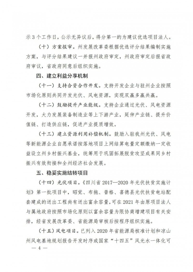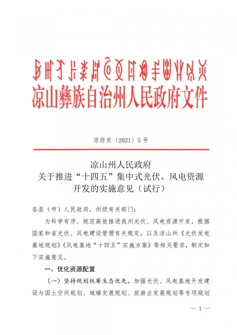 近日,涼山州人民政府發(fā)布《關(guān)于推進(jìn)“十四五”集中式光伏、 風(fēng)電資源開發(fā)的實(shí)施意見(jiàn)(試行)》,意見(jiàn)提出: