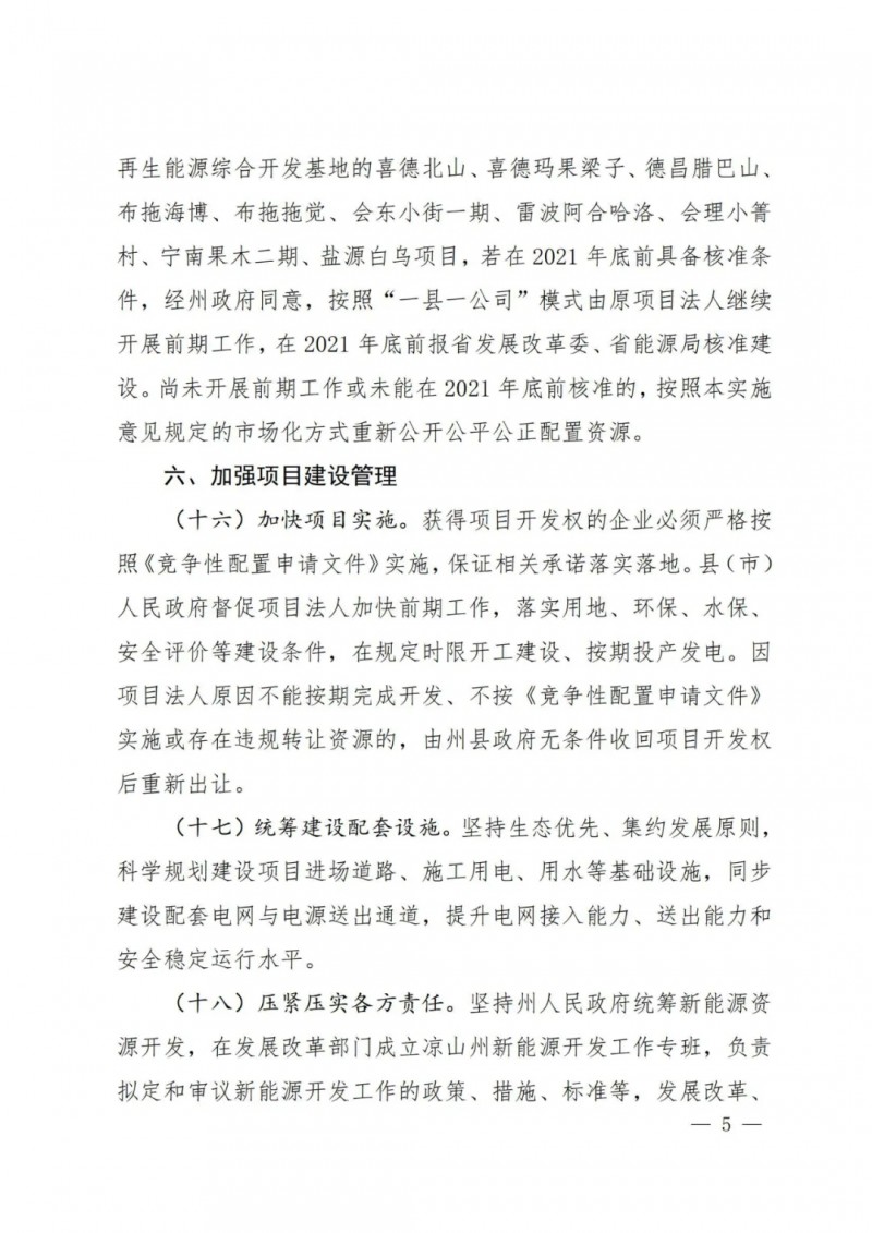 風(fēng)電項(xiàng)目。已列入2020 年省能源局核準(zhǔn)計(jì)劃和涼山州風(fēng)電基地規(guī)劃報(bào)告開發(fā)時(shí)序或國(guó)家“十四五”風(fēng)光水一體化可再生能源綜合開發(fā)基地的喜德北山、喜德瑪果梁子、德昌臘巴山、布拖海博、布拖拖覺(jué)、會(huì)東小街一期、雷波阿合哈洛、會(huì)理小箐村、寧南果木二期、鹽源白烏項(xiàng)目,若在2021 年底前具備核準(zhǔn)條 件,經(jīng)州政府同意,按照“一縣一公司”模式由原項(xiàng)目法人繼續(xù) 開展前期工作,在 2021 年底前報(bào)省發(fā)展改革委、省能源局核準(zhǔn)建 設(shè)。尚未開展前期工作或未能在2021年底前核準(zhǔn)的,按照本實(shí)施 意見(jiàn)規(guī)定的市場(chǎng)化方式重新公開公平公正配置資源。