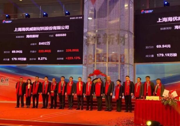 國內光伏膠膜的領軍型企業---海優新材在科創板正式上市。該公司今天開盤價格為200元以上,截至發稿時報價為218元,漲幅為211.7%。這一漲幅在去年至今的所有新能源A股、科創板漲幅中非常之高。