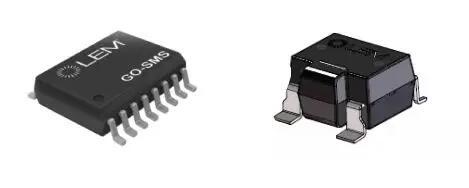 當印刷電路板(Print Circuit Board)上用于電流測量的布板空間比較小時,理想情況是采用芯片式電流測量方案。將初級導體進行集成,直接表面貼裝(Surface Mounted Device)到印刷電路板上,從而降低制造成本,同時也避免混淆各種焊接工藝。LEM 最新開發的GO-SMS(下圖左)/HMSR-SMS(下圖右) 系列電流傳感器均為SMD封裝的芯片式電流傳感器。