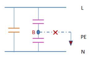 當(dāng)兩個Y電容無差異時,兩個電容可被看作高阻抗的分壓電阻,B點(diǎn)的電壓等于交流電壓220V的一半,即110VAC。此時用電筆去測機(jī)殼,電筆指示燈亮的原因就是機(jī)殼帶了110VAC的電。因?yàn)閅電容的個體差異,以及現(xiàn)場環(huán)境等因素,用萬用表實(shí)測機(jī)殼對地的電壓大多在100-220VAC之間,此時觸碰機(jī)殼會有麻麻的感覺。當(dāng)然,受環(huán)境干濕、鞋子絕緣等情況影響,人體感受也不盡相同。
