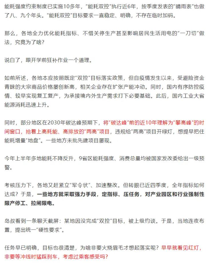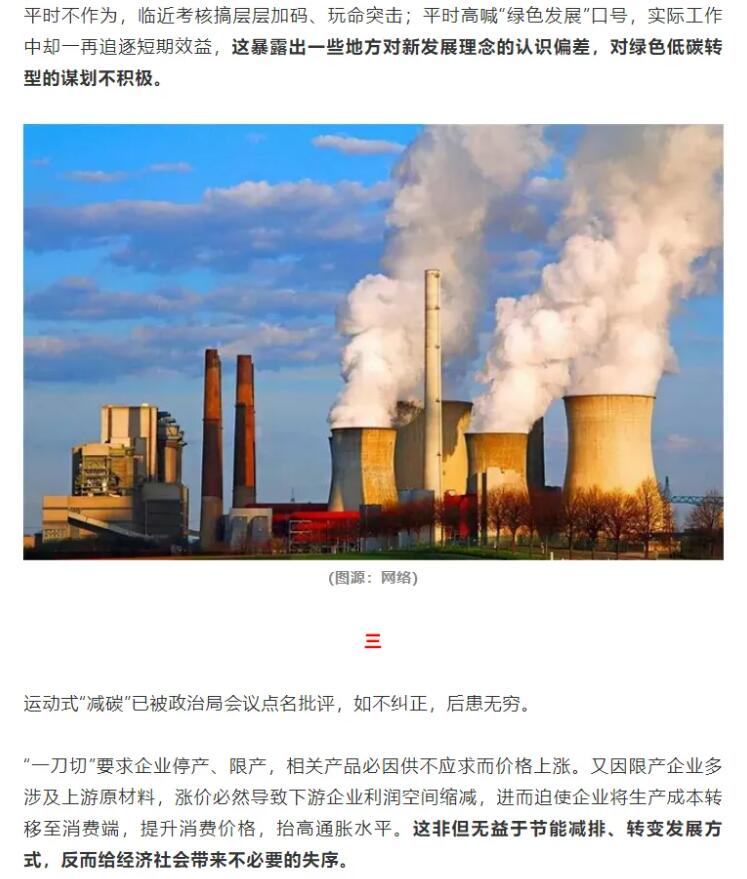 在這一政策的影響下,各地政府層層加碼,許多企業生產陷入停滯,甚至有部分地區居民生活用電、用水也受到影響。對此,人民日報海外版《俠客島》評論稱,平時不作為,臨近考核搞層層加碼、玩命突擊;平時高喊“綠色發展”口號,實際工作中卻一再追逐短期效益,這暴露出一些地方對新發展理念的認識偏差,對綠色低碳轉型的謀劃不積極,“跟開學前狂補作業一個道理。”