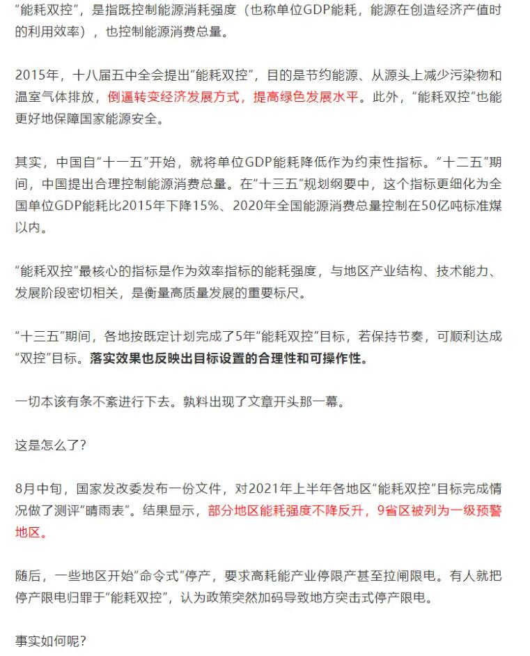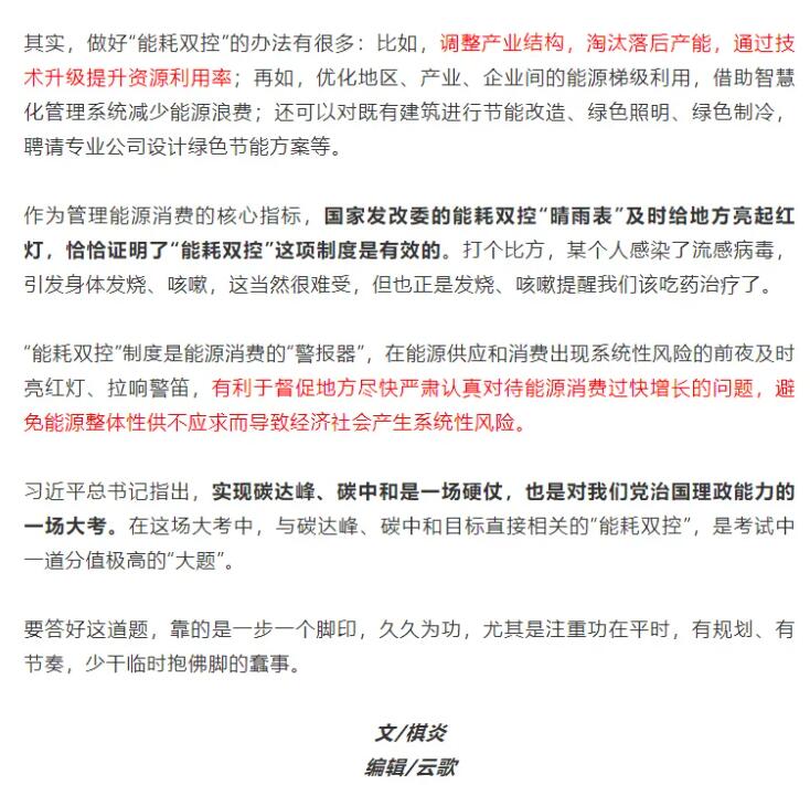 編者按:9月11日,國家發展改革委印發《完善能源消費強度和總量雙控制度方案》,要求各地政府以能源資源配置更加合理、利用效率大幅提高為導向,以建立科學管理制度為手段,以提升基礎能力為支撐,強化和完善能耗雙控制度,深化能源生產和消費革命,推進能源總量管理、科學配置、全面節約,推動能源清潔低碳安全高效利用,倒逼產業結構、能源結構調整,助力實現碳達峰、碳中和目標,促進經濟社會發展全面綠色轉型和生態文明建設實現新進步。