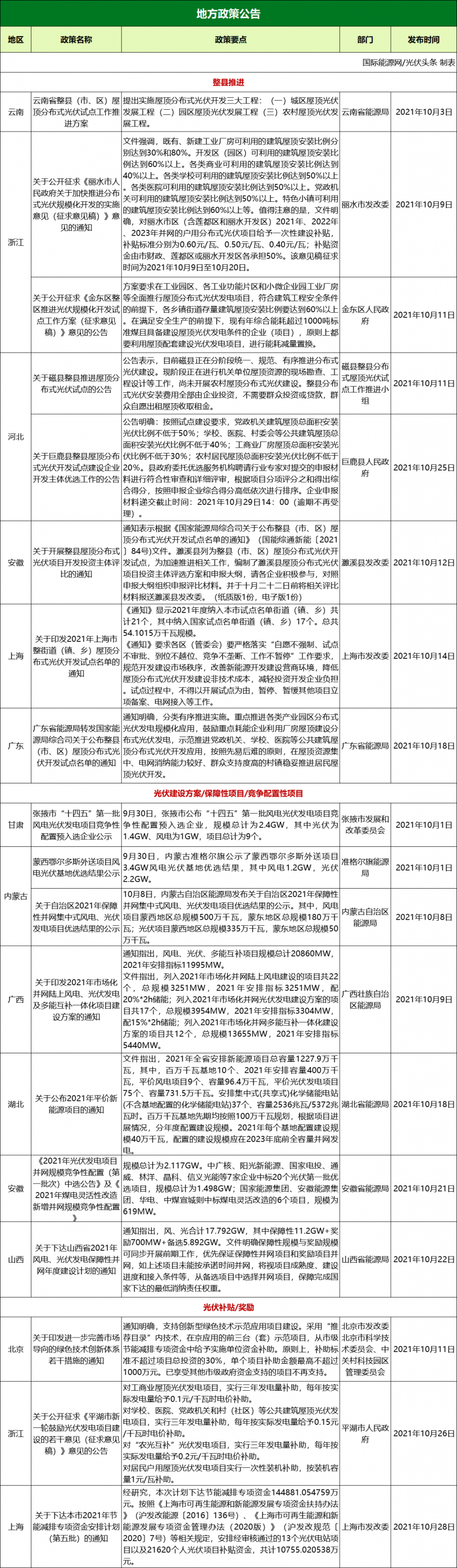 10月份,甘肅張掖市、內蒙古、內蒙古準格爾旗、廣西、湖北、安徽、山西7地相繼公布了2021年保障性項目及競爭性配置項目。甘肅張掖市風電光伏規??傆嫗?.4GW,項目總計為9個;內蒙古準格爾旗公示了蒙西鄂爾多斯外送項目3.4GW風電光伏基地優選結果;內蒙古蒙西地區風電光伏項目總規模835萬千瓦,蒙東地區風電光伏總規模230萬千瓦;廣西公布風電、光伏、多能互補項目規??傆?0.860GW;湖北公布新能源項目總容量1227.9萬千瓦;安徽光伏、煤電靈活改造項目規模總計為2.117GW;山西風、光項目規模共計17.792GW,其中保障性11.2GW+獎勵700MW+備選5.892GW。