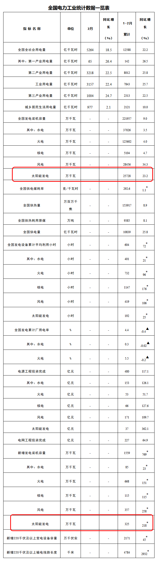 今年1-2月份,全國全社會(huì)用電量為12588億千瓦時(shí),同比增長22.2%。全國發(fā)電裝機(jī)容量為221957萬千瓦,同比上漲9%;其中太陽能發(fā)電裝機(jī)容量25728萬千瓦,同比增長23.2%。