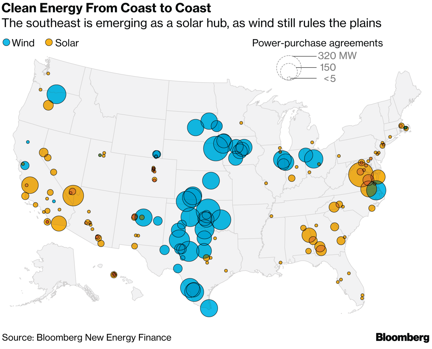 在美國簽署長期合同購買清潔能源的公司一般都在尋找風力發電的中心地帶和沿海國家的太陽能。