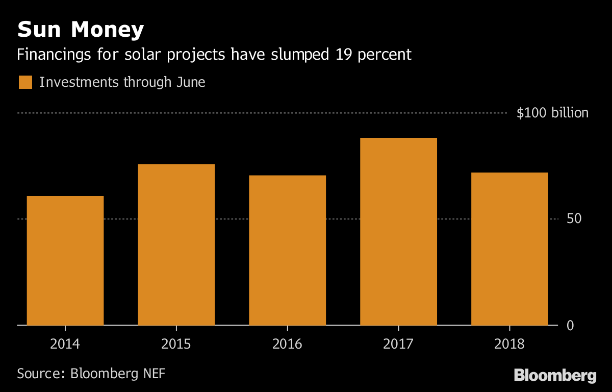 但中國并不是太陽能投資滯后的唯一原因。太陽能電池板的平均價格在去年下降了19%。這意味著太陽能發電場建設成本更低,因此需要的投資降低。