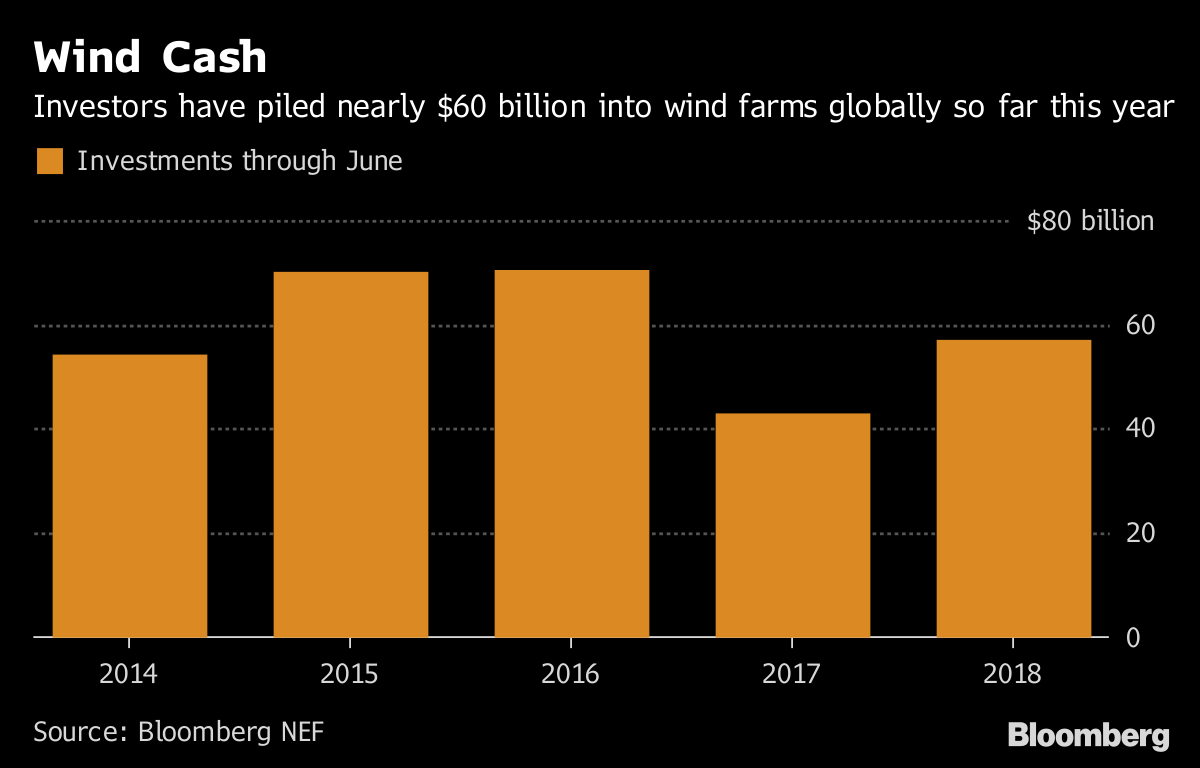 從地區來看,上半年,美國風電投資飆升至175億美元,比2017年上半年翻了一倍多。這是因為開發商正在努力爭取在2019年之后計劃結束的聯邦稅收抵免之前完成投資。