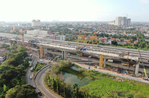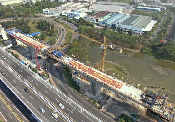 同樣在當天下午合龍的DK15連續梁,是水電八局承擔的1號梁場萬隆至雅加達小里程方向架梁通道上的控制性工程,也是跨度布置為40+64+45+64+40米的連續5跨剛構連續梁。全長253米,共分為4個T形結構、52個節段,是全線連續跨度最多的連續梁。建設者克服了連續梁跨越兩處車密度大的高速公路匝道等高風險施工難題,克服了疫情帶來的不利影響,為小里程方向架梁通道的貫通,奠定了良好的基礎。
