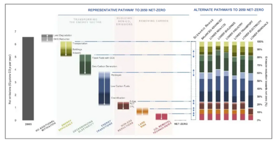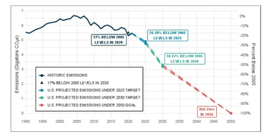 根據拜登政府所制定的計劃,要在2050年前實現凈零排放,需要通過在大部分經濟領域中改用清潔能源——電力實現運行,包括汽車、建筑和工業流程;此外,還需要提高能源效率并擴大使用從大氣中提取二氧化碳的技術。