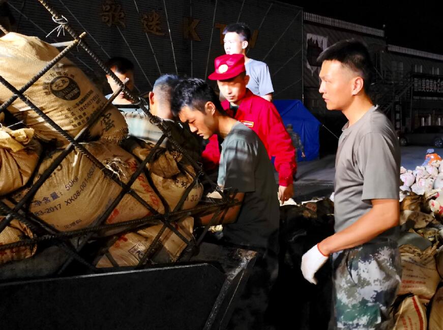 今天上午1臺挖掘機和1臺推土機已被運送至決口右岸,救援隊員抓緊轉運鋼筋籠和沙袋,19時,救援人員把沙袋裝入鋼筋籠,由推土機將其推入河中,以封堵決口、加固堤壩,有效加速決口合攏。